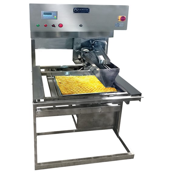 This machine irrigates and distributes uniformly hot liquid into rectangular trays, like butter, ghee or syrup. The IRDC 600-800 is equipped with a special dosing system to select the required , amount of liquid. The dosing is based on scale/weight system.